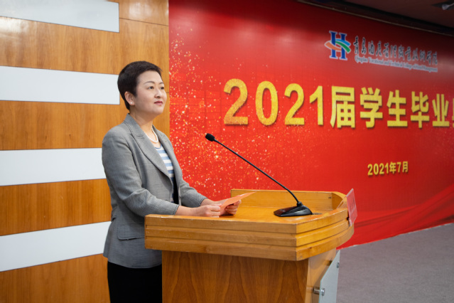 家长代表、2018级会计与审计01班朱佳路同学家长姜风艳代表全体毕业生家长,对学院领导、老师表示衷心感谢,叮嘱孩子们常怀感恩之心,树立终身学习意识与能力,凭借竞争力和免疫力奔赴理想。