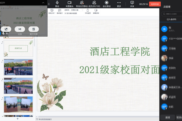 加强家校互动,携手筑牢学生健康安全“保护墙”。学院组织所有班级开展线上家长会,加强家校沟通,推进家校协同,共同为学生健康安全尽心尽力。通过线上沟通,辅导员向家长们介绍了学校疫情防控、学生在校学习生活情况,转发了学校发布的《致家长的一封信》和酒店工程学院疫情防控应急演练视频等内容。同时,对学生家长关心的问题进行解答,赢得了家长们的理解、信任和支持。