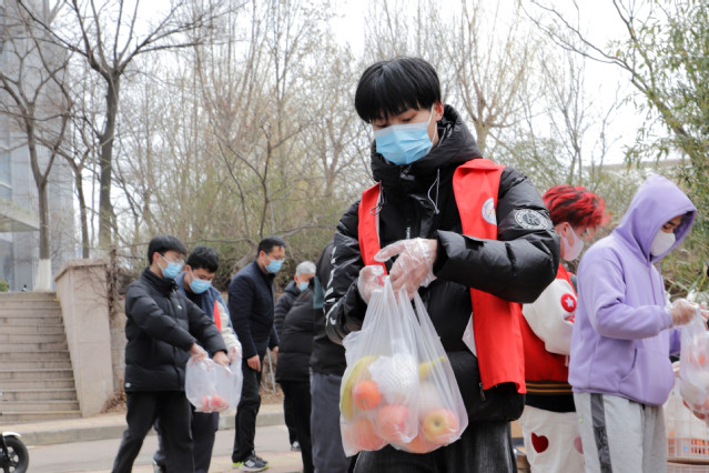 “水果到学校门口了,马上准备接应卸货分发!”上午8时,水果运输车到达学校东区转运站,工作人员对车门把手等接触部位进行了全面消杀,对水果箱体进行了擦拭。来自行政、教辅、后勤、各二级院部的师生志愿者们,忙碌的身影便开始活跃在校园各学生公寓楼派送点。筛选分装、校内运送、分点发放、现场组织……近10000份水果经由志愿者送到了每一位师生手里。小小的水果传递了学校对师生们的关爱,鼓舞着师生携手同心、共克时艰。
