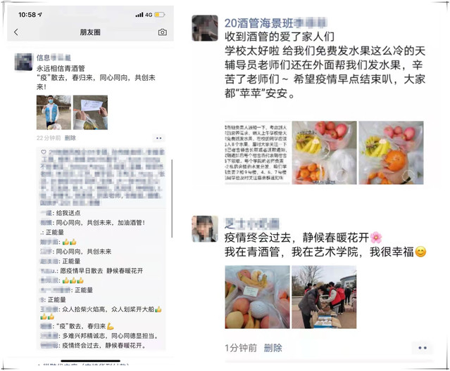 “大爱学校!真得太贴心了!”“青酒管yyds”“我们就是传说中的‘别人家的大学’!”“感恩有你,让我们一起静待春来疫散!”收到这份别样的“暖心礼”后,师生们纷纷晒出了自己对学校的感谢和对战“疫”的信心。甜甜的水果温暖着师生的心、洋溢着浓浓的情,一时间,这份暖心冲上“校园热搜”,成为了大家朋友圈里的“顶流”。据了解,校园严格封闭管理期间,“水果免费送”活动将会在下个周末持续送上温暖。