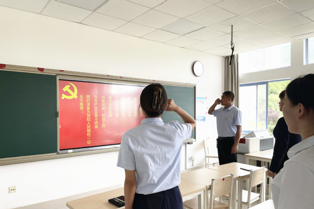 学生党支部组织学生党员开展重温入党誓词活动。全体党员面向党旗,重温入党誓词,神情庄重、声音铿锵,进一步提升了党员身份的光荣感、责任感和使命感。随后,大家结合实际分享了心得感悟,更加坚定了听党话、感党恩、跟党走的信心和决心。