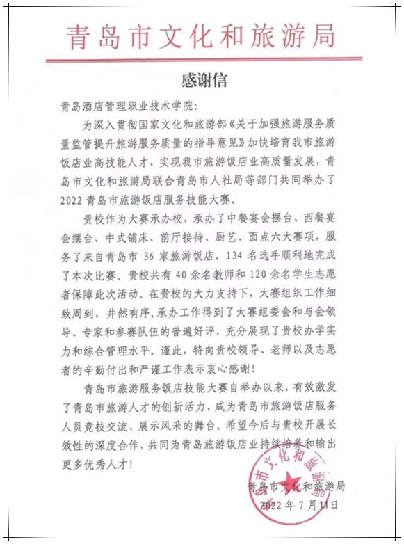 本网讯(酒店管理学院 烹饪学院)近日,青岛市文化和旅游局发来感谢信,对学校高质量承办2022年青岛市旅游饭店服务技能大赛表示感谢,对学校在办赛中所作的突出贡献给予肯定。