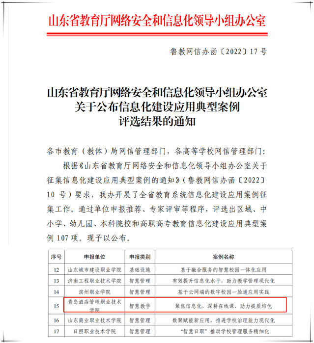 本网讯(教务处 教育信息中心)近日,山东省教育厅网络安全和信息化领导小组办公室下发了《关于公布信息化建设应用典型案例评选结果的通知》(鲁教网信办函〔2022〕17号),万象城官网报送的案例《聚焦信息化,深耕在线课,助力提质培优》入选。