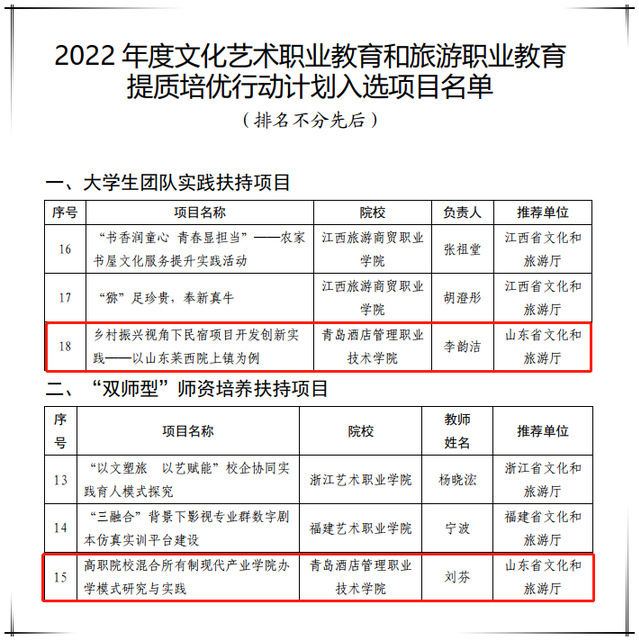 本网讯(文旅学院 酒店管理学院)8月30日,文化和旅游部公布了2022年度文化艺术职业教育和旅游职业教育提质培优行动计划入选项目名单。万象城官网文旅学院刘芬副教授主持的《高职院校混合所有制现代产业学院办学模式研究与实践》项目入选“双师型”师资培养扶持项目,酒店管理学院李峰副教授、杨轶哲老师指导的《乡村振兴视角下民宿项目开发创新实践——以山东莱西院上镇为例》项目入选大学生团队实践扶持项目。