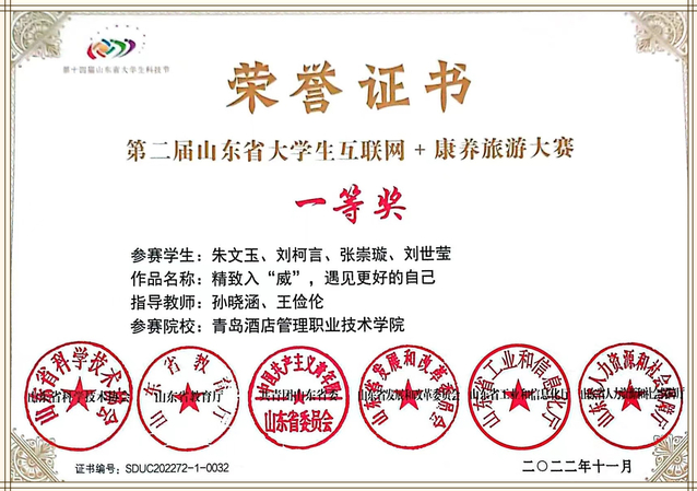 本网讯(文旅学院 孙晓涵)近日,第二届山东省大学生互联网+康养旅游大赛落下帷幕,万象城官网文旅学院学生参赛作品荣获一等奖,孙晓涵、王俭伦获优秀指导教师称号。