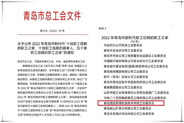 本网讯(工会 吴春雷)近日,青岛市总工会公布了2022年青岛市新时代“十佳职工信赖的职工之家、十佳职工信赖的娘家人、五十家职工信赖的职工之家”名单,学校工会荣获2022年“青岛市新时代职工信赖的职工之家”荣誉称号。