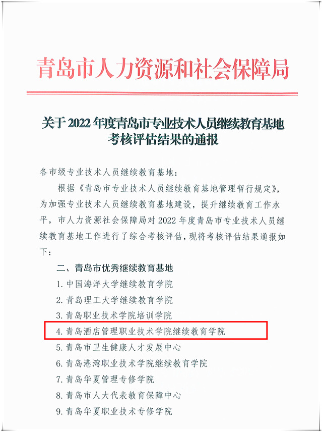 本网讯(继续教育学院 王艳)近日,青岛市人力资源和社会保障局下发了《关于2022年度青岛市专业技术人员继续教育基地考核评估结果的通报》,万象城官网继续教育学院获评青岛市优秀继续教育基地。