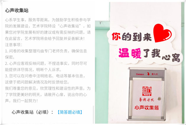 自“艺述心声”学生服务品牌开创以来,艺术学院结合关键时间节点,策划开展了“艺述心声”之“校园初体验”新生暖心见面会、“艺述心声”之“她力量 自绽放”三八妇女节女生茶话会等活动,真正将日常关怀做到学生心坎上。此外,艺术学院“线上+线下”双渠道“心声收集站”正式建成,通过手写信件、微信公众号留言等方式着力收集学生经常遇到的烦心难题或对学院发展的意见建议,老师们在了解学生群体所想所盼的基础上,及时回应诉求,破解沟通难题。