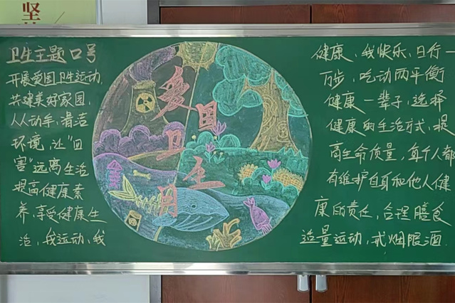 学校通过张贴宣传标语、绘制黑板报、电子大屏幕、举行创意作品大赛等形式广泛宣传第35个爱国卫生月,普及健康卫生知识。通过宣传教育,充分带动广大师生积极参与到爱国卫生月系列活动中来,形成人人讲卫生、处处环境优的良好校园氛围。