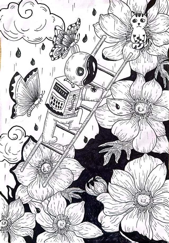 为化解当前大学生极易出现的心理健康问题,“艺心”心理工作站将其以“人生黑点”比拟,“小小黑点”绘人生,“积极心态”乘风浪。学生们围绕着“黑点元素”进行创意绘画,借助最终完成的蹁跹画作,逐步懂得“没有谁的人生完美无瑕,面对失意挫折或是未知挑战,应直面困境、勇敢前行”的道理。