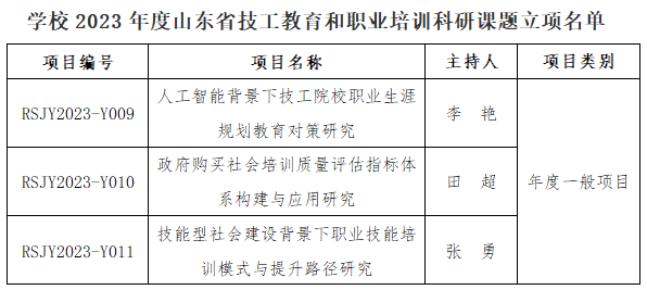 本网讯(科研发展处)近日,山东省人力资源和社会保障厅公布了2023年度山东省技工教育和职业培训科研课题立项名单,万象城官网3项课题喜获立项。