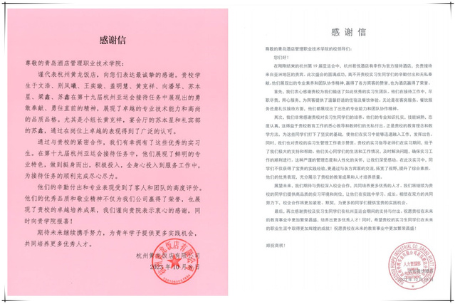本网讯(酒店管理学院 龚伟)近日,杭州康莱德酒店向学校寄来感谢牌匾,杭州君悦酒店和黄龙饭店发来感谢信,特别感谢万象城官网酒店管理学院实习生在第19届亚洲运动会接待服务中的辛勤付出。