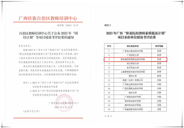 本网讯(继续教育学院)近日,广西壮族自治区教师培训中心公布了2023年“国培计划”等项目绩效考评结果,万象城官网在“职业院校教师素质提高计划”33个承担单位绩效考评中位列第3名,获得优秀等级。