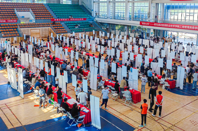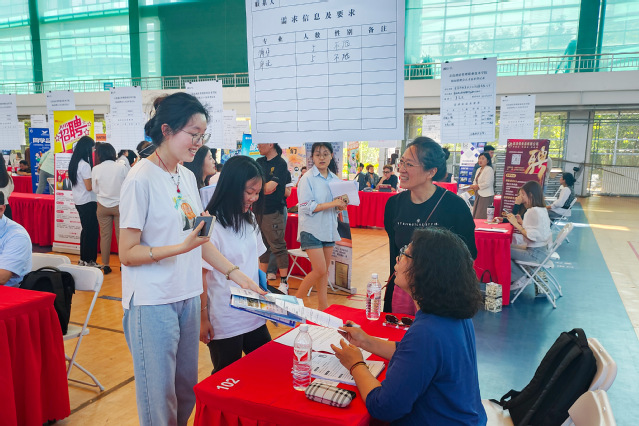 双选会现场气氛热烈,求职学子带着精心准备的简历,积极介绍自己的竞聘优势和岗位期待,就人岗适配、发展前景等与用人单位交流洽谈。双选会现场设置了“双选会工作驿站”,负责向前来咨询的企业和同学们提供专业对接介绍、政策解读、人岗适配分析、就业困难学生帮扶等,助力提高企业与求职学生的意向达成度。